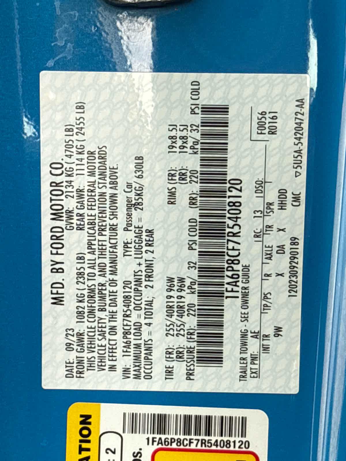 Tire Repair Kit, Red Painted Brake Calipers w/White Logo, Black Mirror Caps, Black GT Pony Badges, Headlamps w/Black Bezels, 3.55 LIMITED SLIP REAR AXLE, GRABBER BLUE BRAKE CALIPERS W/WHITE LOGO, stop/start system and Port Fueled Direct Injection (PFDI) (STD). Non-Smoker vehicle